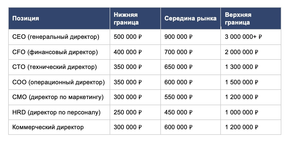 В пересчёте на ежемесячный оклад без учёта бонусов и опционов картина выглядит следующим образом. Генеральный директор (CEO) крупной московской компании получает в среднем от 500 000 до 3 000 000 рублей в месяц — данный диапазон охватывает как средних игроков с выручкой от 1 миллиарда рублей, так и лидеров отраслей с многомиллиардными оборотами. Финансовый директор (CFO) зарабатывает от 400 000 до 2 000 000 рублей. Операционный директор (COO) — от 350 000 до 1 500 000 рублей. Технический директор (CTO) — от 350 000 до 1 300 000 рублей. Директор по маркетингу (CMO) — от 300 000 до 1 200 000 рублей. Директор по персоналу (HRD) — от 250 000 до 1 000 000 рублей. По данным SuperJob за 2025 год, средняя рыночная зарплата директора по персоналу в Москве составляет 320 000 рублей.