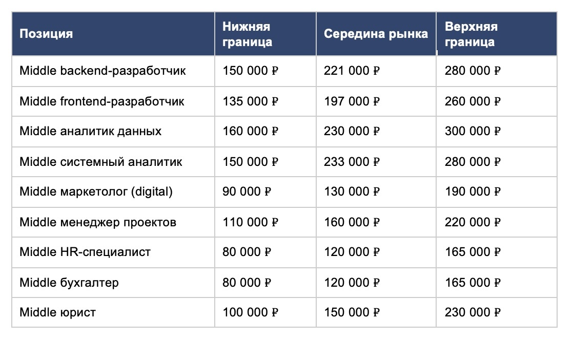 Разработчик уровня мидл в Москве зарабатывает в среднем от 150 000 до 280 000 рублей в зависимости от стека: бэкенд-мидл — 150 000–250 000 рублей, фронтенд-мидл — 135 000–220 000 рублей. Аналитик данных (мидл) — 180 000–280 000 рублей. Маркетолог-мидл с опытом в диджитале — 100 000–180 000 рублей. Менеджер проектов уровня мидл — 120 000–200 000 рублей. Специалист по финансовому учёту — 100 000–180 000 рублей. Мидл-аналитик (системный, продуктовый) — 170 000–270 000 рублей. HR-специалист уровня мидл — 90 000–160 000 рублей. Бухгалтер (без функции главного) — 90 000–160 000 рублей.