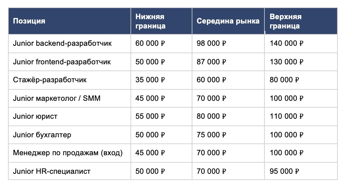 Начинающий разработчик (джуниор) в Москве получает от 60 000 до 120 000 рублей в зависимости от стека и работодателя. Стажёры, только вышедшие на рынок после курсов, могут рассчитывать на 40 000–70 000 рублей. Начинающий маркетолог или SMM-специалист — от 50 000 до 90 000 рублей. Начинающий юрист — от 60 000 до 100 000 рублей. Начинающий бухгалтер или финансовый специалист — от 55 000 до 90 000 рублей. Младший менеджер по продажам — от 50 000 до 90 000 рублей на фиксе плюс бонусы от результата. HR-специалист начального уровня — от 55 000 до 85 000 рублей. По данным hh.ru, доля вакансий, открытых работодателями для кандидатов без опыта или с опытом до года, выросла с 40% в 2024 году до 42% в 2025-м, что отражает вынужденное снижение требований по ряду позиций.